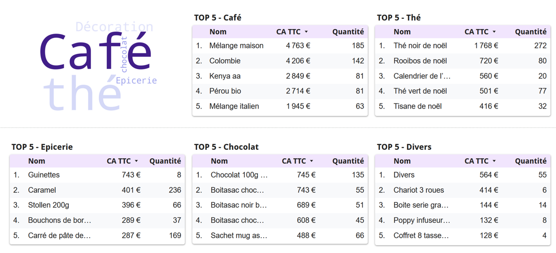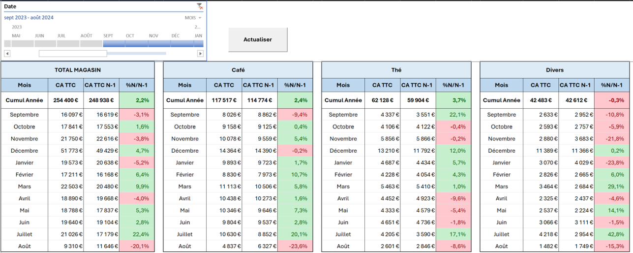 Organisation des fichiers de ventes et création d’un tableau de bord clair pour suivre les ventes café, thé et épicerie fine.